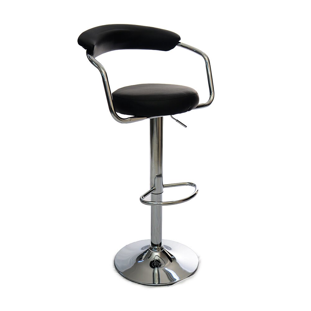 This black bar stool combines simplicity with functionality, making it a versatile addition to office breakrooms or creative workspaces. Featuring a cushioned seat and curved backrest upholstered in soft microfiber leather, it ensures comfort during casual meetings or coffee breaks. The sturdy chrome frame with a footrest adds both durability and style, while the height-adjustable design allows for easy customization to suit different counter heights. This stool is a practical choice for a contemporary office setup.